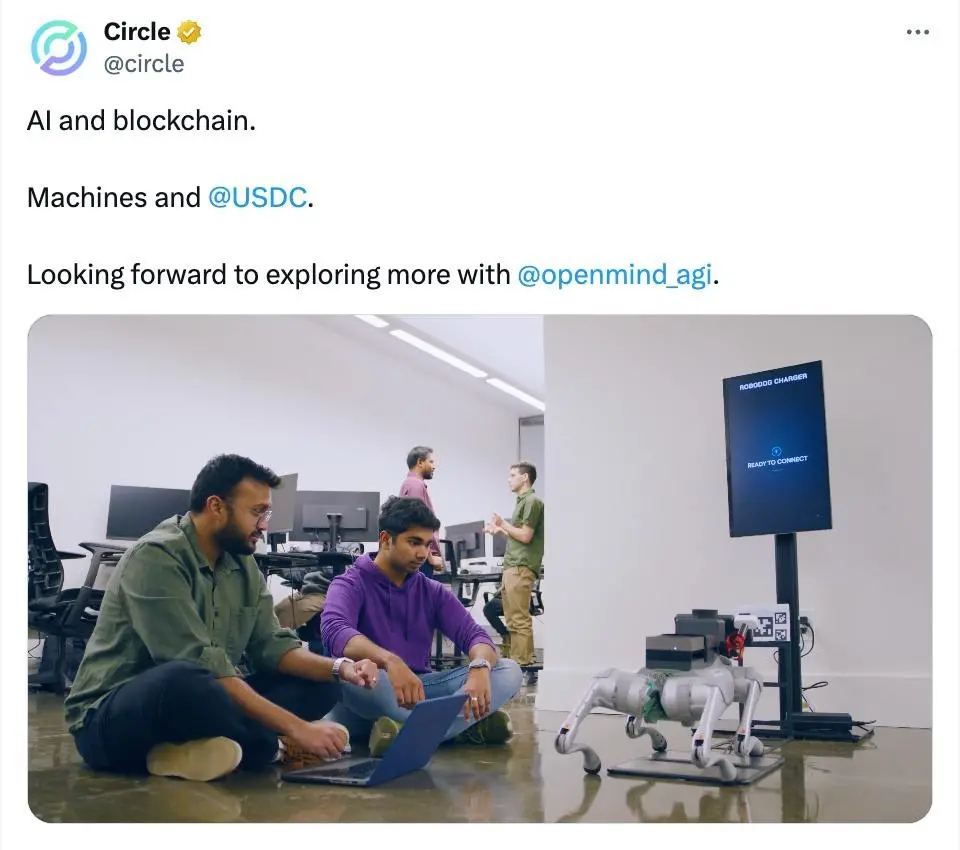 去年12月,OpenMind 宣布和 Circle 合作,在硅谷部署了全球首个“USDC 机器人自充点”。