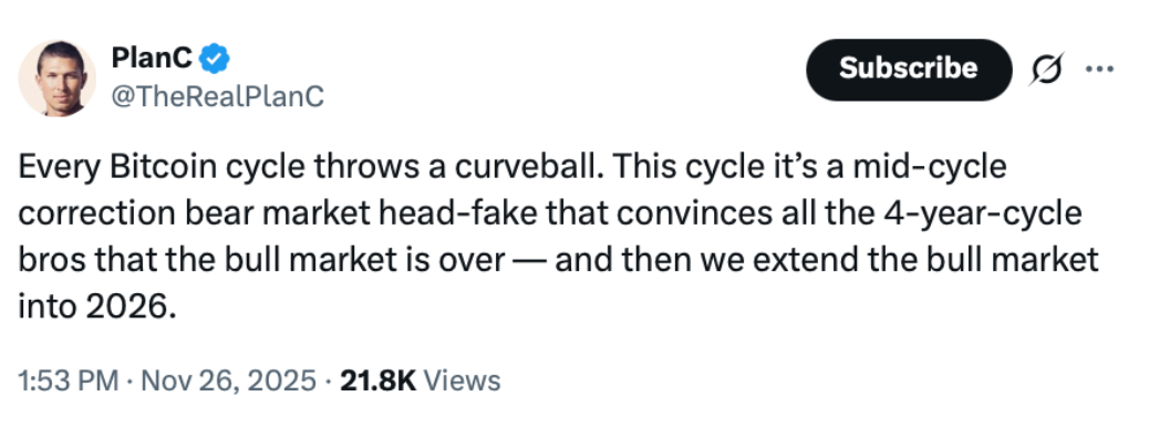 ● 如今,他的立场发生了微妙变化,从坚定的具体价格目标,转变为更具弹性的“可能性”表述。Lee现在认为,比特币在年底前“很有可能”突破10万美元,甚至可能会重新回到10月份创下的12.51万美元历史高点。 他并未完全放弃看涨立场,但调整了预期的幅度与确定性。
