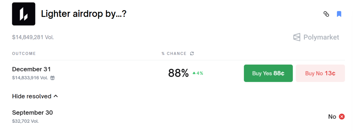 积分转换率估计为每个积分 20-28 个 LIT,场外交易(OTC)中积分价值约 11 美元。整体社区分配 50%,剩余 25% 用于未来空投、伙伴和赠款。Lighter 团队市场负责人表示,TGE 与空投会同时上线,此外也不会付费给 CEX 上市。