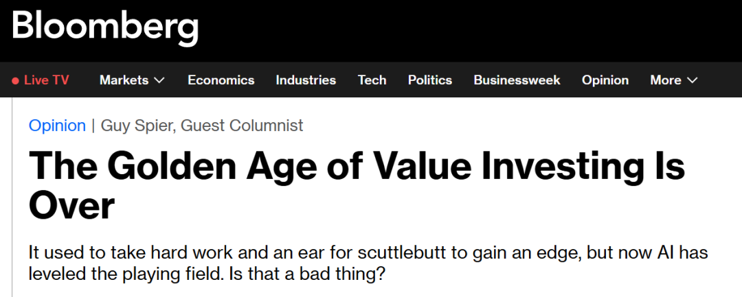 (Aquamarine Capital) 掌门人盖伊 · 斯皮尔 (Guy Spier) 在 2025 年 9 月在彭博发表了一篇文章《价值投资的黄金时代已经结束》( The Golden Age of Value Investing Is Over ),在市场引起了热议。