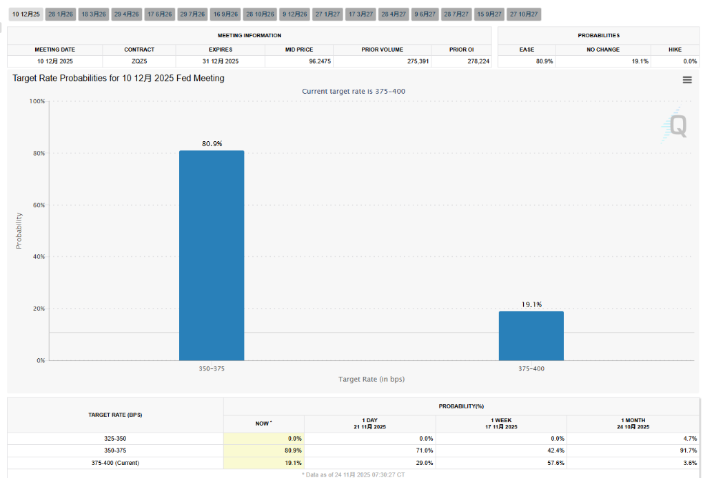 ● 根据CME“美联储观察”数据,美联储12月降息25个基点的概率已飙升至82.9%,较前一日的69.4%大幅提升。这一系列信号极大地鼓舞了投资者,促使资金重新流向风险资产。