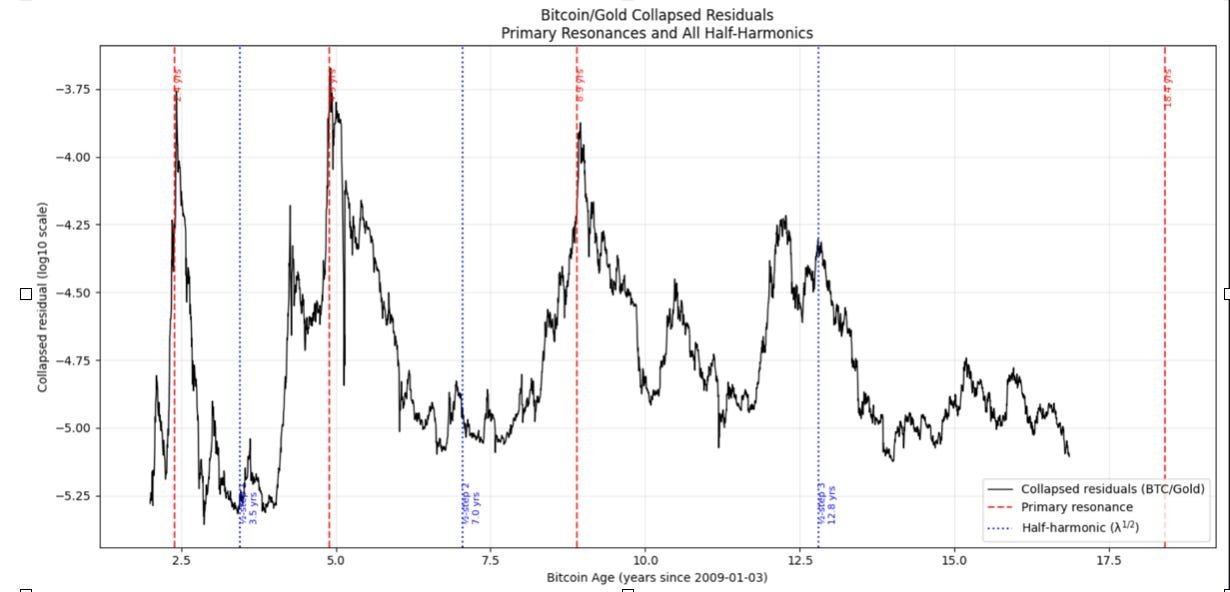 DSI 的基模波长参数 λ = 2.07(对数时间),大致对应泡沫间隔的两倍。2017 年泡沫是最后一个基模,2021 年是第一次谐波,2025 年在本框架下预期不会出现泡沫。下一轮以黄金计价的比特币峰值预计在 2026 年四季度(小波分析最低值)至 2027 年二季度(傅里叶分析值)之间出现。