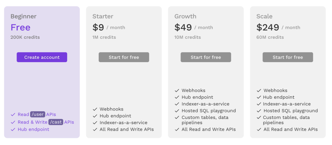 对于投资方而言,Farcaster 虽然愿景宏大,但作为一家拥有 10 亿美元估值的独角兽,其运营成本极高且近期增长面临瓶颈。相比之下,Neynar 早早通过建立了清晰的商业路径,打开其定价页面与开发者文档便可发现,其通过向开发者收取 API 调用费、增值服务年费等方式,实现了健康的现金流,成为了生态内少有的具备「造血能力」的主体。