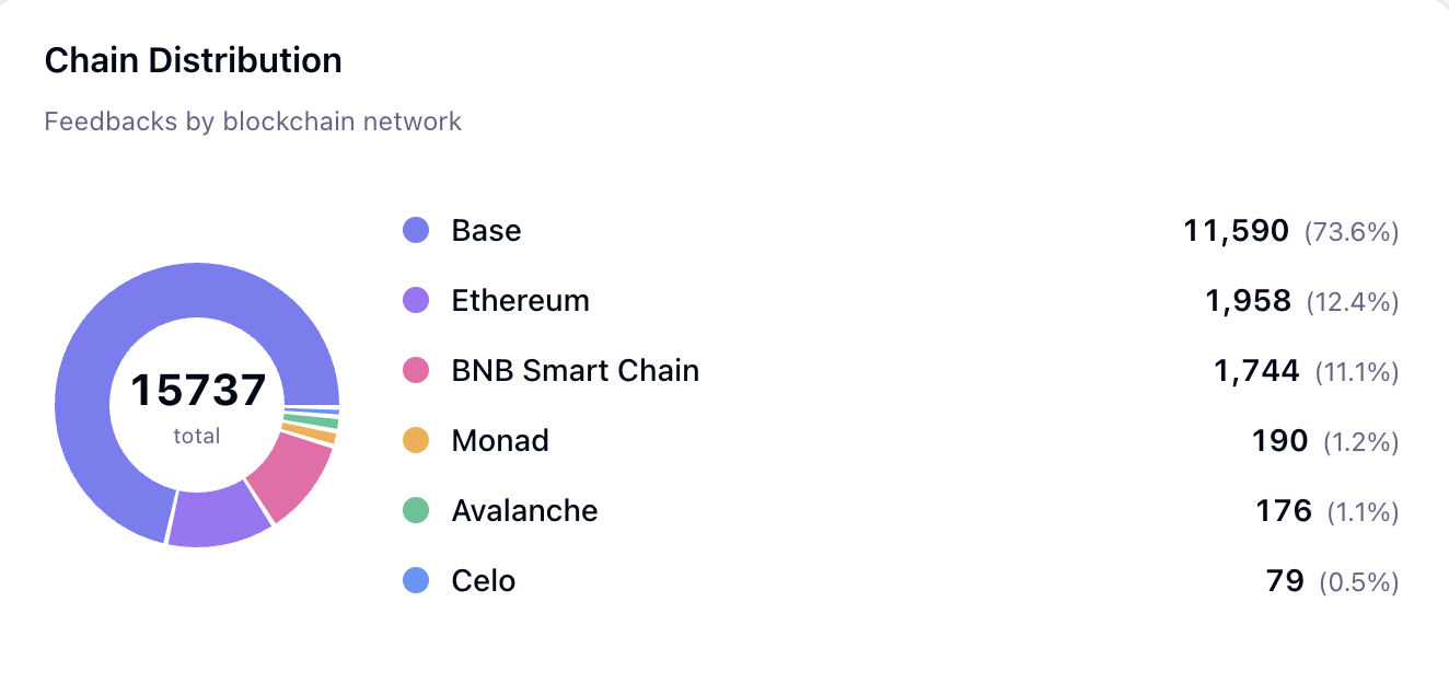 但从真实互动情况来看,生态仍处于早期阶段。截至目前,累计反馈数约为1.5万条,平均每个Agent获得不足1条。这意味着,多数Agent仍处于冷启动阶段,实际使用与用户互动相对有限。不过,Base获得的反馈数量占比高达73.6%,远超以太坊、BNB Chain、Avalanche等网络,这意味着当前实际互动与活跃场景正在向Base集中。这或与近期爆火的OpenClaw点燃了Base上的Agentic生态热潮有关。