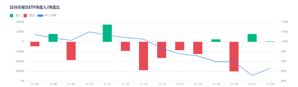 ● ETF资金流出放缓至单日净流出降至1亿美元以下时,可能意味着抛压接近尾声;